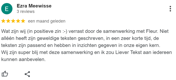 Als je 't mij vraagt, moeten de teksten voor je bedrijf je houvast, vertrouwen en inspiratie geven. Ze moeten je helpen om die volgende stap te zetten. En je er keer op keer aan herinneren hoe jouw aanbod het verschil maakt voor een ander.